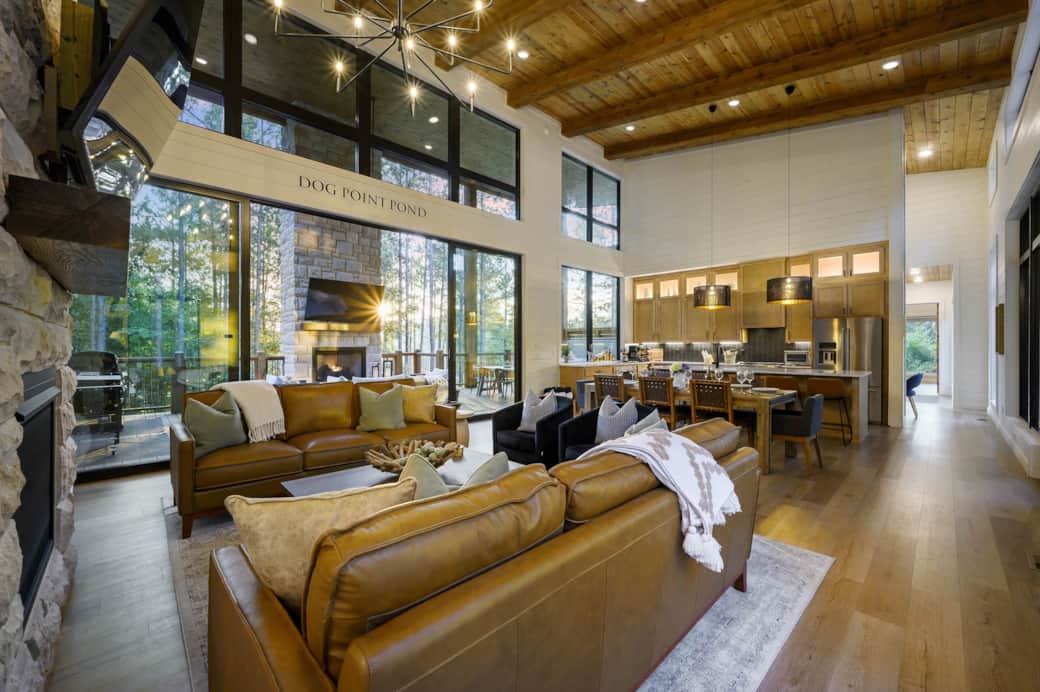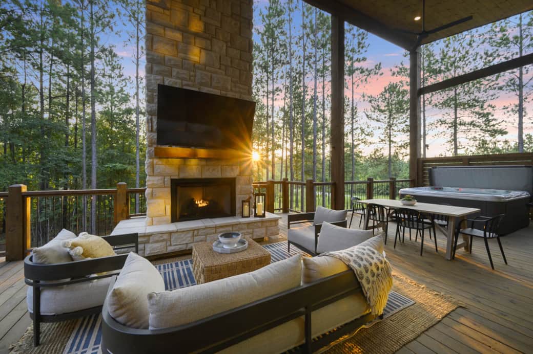 Dog Point Pond Cabin features a soaring covered deck with outdoor fireplace, dining area, hot tub, and peaceful pond views. Inside, enjoy an open living space with shuffleboard, Xbox, and smart TVs. A fully equipped kitchen, Wi-Fi, and washer/dryer provide every comfort for families, friends, and pets in this modern Broken Bow retreat.